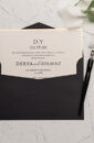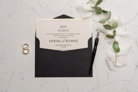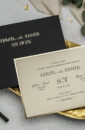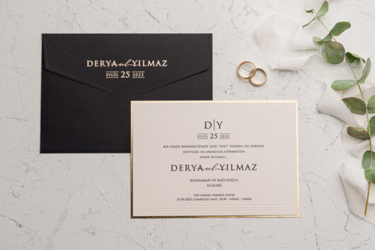 Invitatie de nunta potrivita pentru cuplurile indraznete si moderne, care vor sa iasa din tiparele unei nunti traditionale. Textul se tipareste pe un carton crem cu margini aurii si emboss. Invitatia are asortat un plic negru.