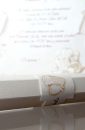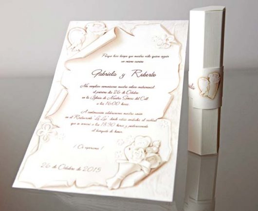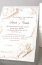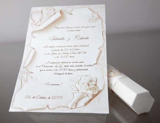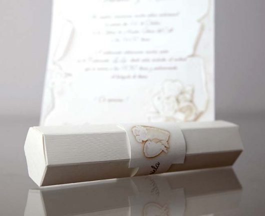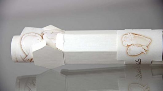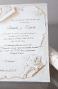 Invitatie de nunta confectionata dintr-un carton subtire, mat, destinat diparirii textului. Acesta se ruleaza, si se introduce intr-o cutiuta hexagonala, confectionata dintr-un carton texturat, sidef.
