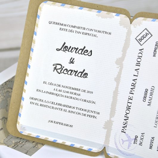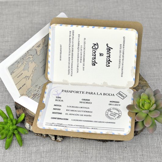 Invitatie de nunta tip pasaport, confectionata dintr-un carton pe care se tipareste textul invitatiei. Acesta se prinde intr-un carton craft natur. In mijloc prezinta un decupaj in forma de inima. Plicul alb este inclus in pret. Interiorul de plic NU este inclus in pret si se achizitioneaza separat. (Cod interior plic. P13)